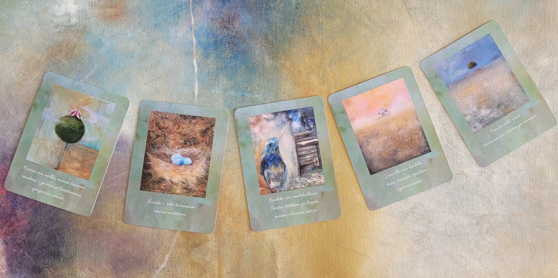 Jokainen kortti sisältää minun uniikista taulusta taidekuvan ja ajatuksen.